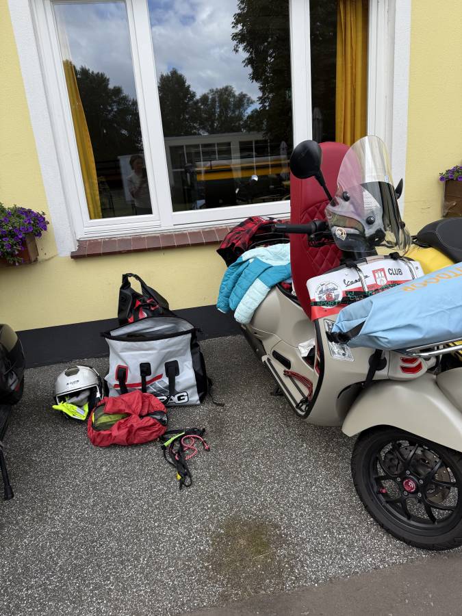 Somit, es durfte nichts fehlen, nahmen wir alles huckepack auf den Roller. Das Zelt, den Schlafsack, die Matte und noch dies und das. Tja, unglaublich, aber es hat funktioniert. Unser Präsi ist das ja alles von vielen Fahrten gewohnt und sehr geübt. Aber der Rest? Eher nicht.