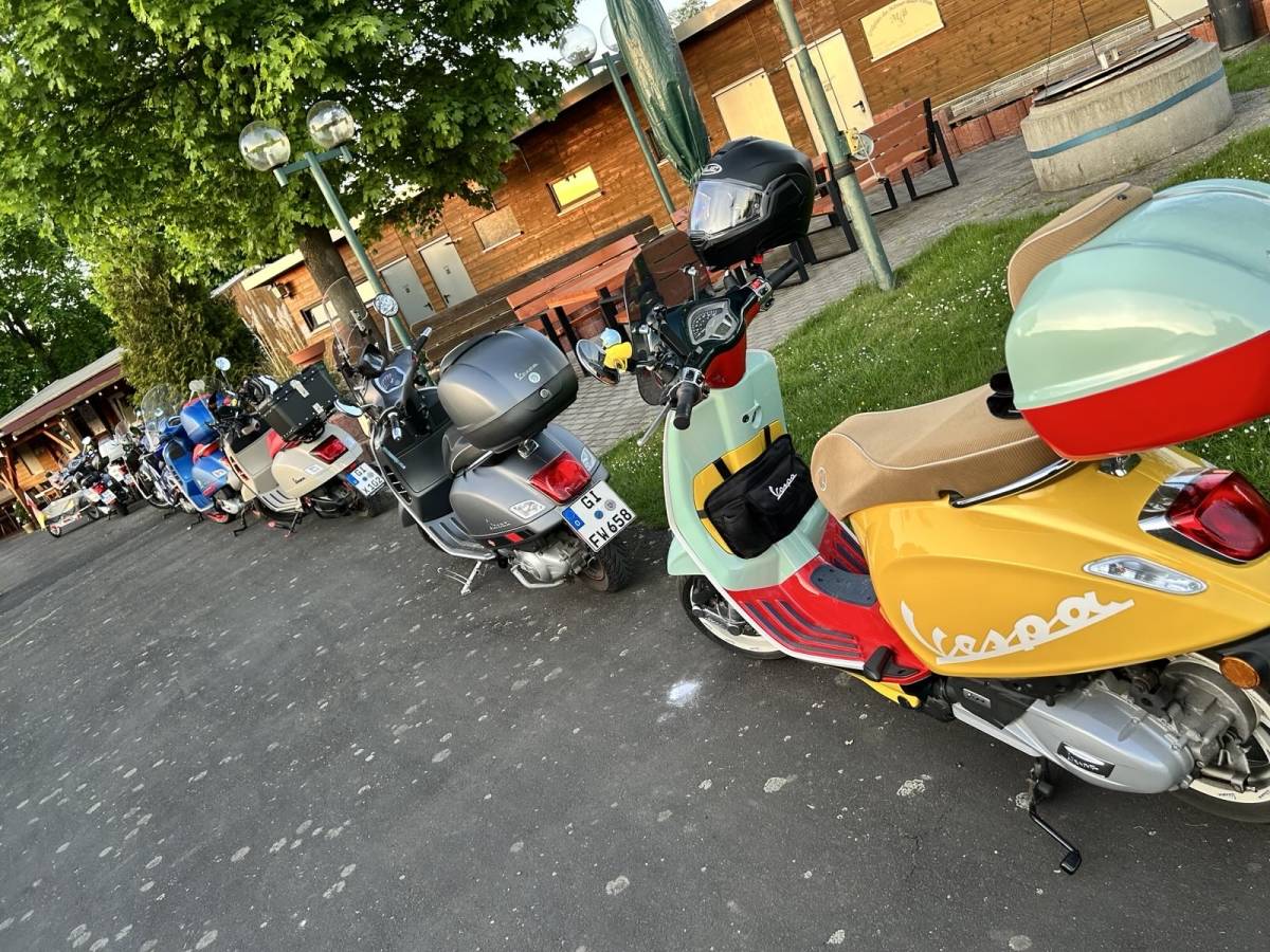 Da, im Restaurant „Gaststätte zum Kirschenwäldchen“, waren ausreichend Plätze für uns 17 (!) Fahrer/-innen bestellt. Bei Kaffee und Kuchen wurde geplaudert und auch über die letzten beiden Fahrten nach Pontedera und nach Hofheim erzählt. Auch das Anrollern in Aschaffenburg war Thema, das war wohl ein bisschen chaotisch - so wurde berichtet. Aber es gibt auch anderes zu Berichten – Katja und Bernd sind etwas früher als berechnet Großeltern geworden und Anja ist dem Club beigetreten! Glückwunsch an alle!
