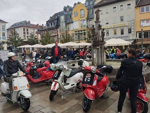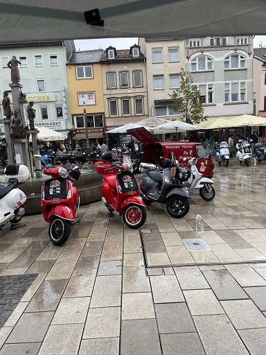 Nach der Ankunft hieß es erstmal Quartiere beziehen, um dann einen wunderschöner Abend in der Altstadt von Kreuznach beim Italiener zu verbringen. Mittlerweile hatten sich Nicole und Oliver aus Köppern mit ihren beiden feuerroten nagelneuen Vespen dazugesellt und auch Dennis, als der zweite Organisator, war mit dabei. Es war somit ein gelungener erster Abend in Kreuznach - es war noch alles wunderschön und trocken! Am nächsten Morgen, nach durchregneter Nacht - Mist, mein Helm hing am Roller und hatte mal locker ein Liter Wasser aufgefangen! Also erstmal eine Stunde geföhnt - es half! Dann sind wir zum zum Kornmarkt gestarte - wie kommen wir da bloß trotz all der Baustellen hin? Freundliche Vespa Fahrer aus der Gegend haben uns begleitet und bei der Navigation geholfen.